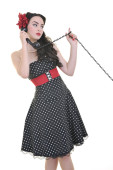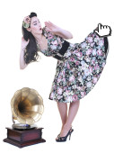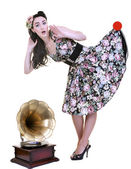 ładna dziewczyna słuchania muzyki na stary gramofon