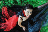 ładna dziewczyna słuchania muzyki na stary gramofon