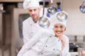Pewny siebie kucharz stojący z rękami skrzyżowanymi w kuchni
