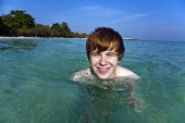czerwone włosy chłopak cieszy się krystalicznie czysta woda