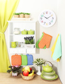 piękne białe meble z naczynia i wystrój, na tle ściany kolor