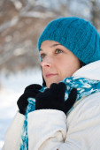 Szczęśliwa młoda Europejka w białej dzianinie kapelusz i szalik i niebieskie rękawiczki świąteczne śmiejąc się pod śniegiem