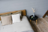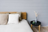 wystrój wnętrz. Naturalne materiały we wnętrzu sypialni. Minimalistyczna skandynawska kompozycja. Koncepcja komfortowego życia.