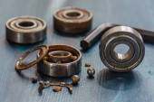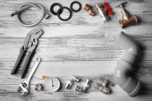 Zdjęcie "Praca w kanalizacji. Rozwiązywanie problemów odbywa się na starym, niebieskim drewnianym stole. Pracownik w rękawiczkach obraca kranem zimnej ciepłej wody. eliminując w ten sposób podział" może być wykorzystywane do celów osobistych i komercyjnych zgodnie z warunkami zakupionej licencji Royalty-free. Obraz jest dostępny do pobrania w jakości wysokiej rozdzielczości do 5760x3840.