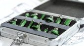 Praca w kanalizacji. Rozwiązywanie problemów odbywa się na starym, niebieskim drewnianym stole. Pracownik w rękawiczkach obraca kranem zimnej ciepłej wody. eliminując w ten sposób podział