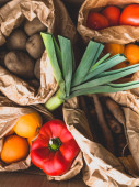 Zdrowa żywność czyste jedzenie wybranych owoców i warzyw, bogate w witaminy i przeciwutleniacze. Ekologiczne opakowanie papierowe wielokrotnego użytku torba, z tworzyw sztucznych Zero odpadów stylu życia