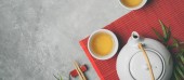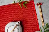 Azjatycka herbata. Czajnik i Kielich z pałeczkami na czerwonej matie bambusowej na szarym tle kamienia z miejsca do kopiowania. Makieta do menu.