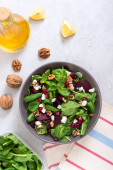 Pyszna dieta sałatka fitness ze szpinakiem, jabłkami, czerwoną cebulą, serem błękitnym, orzechami. Właściwe odżywianie. Lekkie konkretne tło.