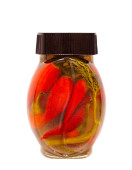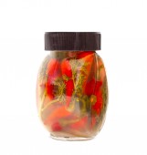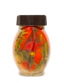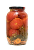 Szklany słoik z czerwonymi pomidorami w puszce na białym tle.