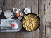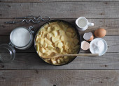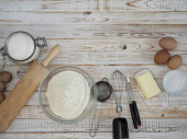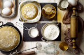 Zdjęcie "Na kuchennej desce do krojenia naczynia do pieczenia z ciastem. Składniki i naczynia kuchenne w pobliżu na starożytnym drewnianym stole. Widok z góry." może być wykorzystywane do celów osobistych i komercyjnych zgodnie z warunkami zakupionej licencji Royalty-free. Obraz jest dostępny do pobrania w jakości wysokiej rozdzielczości do 5760x3840.