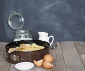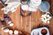 Na kuchennej desce do krojenia naczynia do pieczenia z ciastem. Składniki i naczynia kuchenne w pobliżu na starożytnym drewnianym stole. Widok z góry.