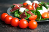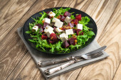 Świeża sałatka warzywna z fetą, oliwki i zioła w ciemnym talerzu na ciemnym rustykalnym tle. Zdrowe wegańskie jedzenie.