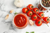 Kompozycja płaska z sosem pomidorowym na białym drewnianym stole
