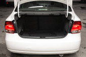Nowosybirsk, Rosja 13 października 2019: Volkswagen Polo, zbliżenie otwartego bagażnika, reflektor, zderzak, widok z przodu. Wygląd nowoczesnego samochodu