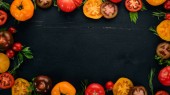Świeże soczyste pomidory na zielonym tle, widok z góry.