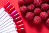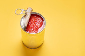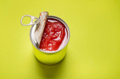 Otwarta puszka z pomidorami w puszce, na czerwonym tle