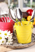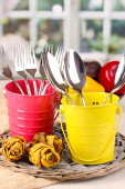 sztućce kuchnia w metalu stoiska z czystego naczynia na obrus na beżowym tle