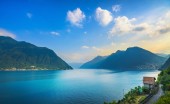 Jezioro Lugano panoramiczny pejzaż. Miasto i góry. Ticino, swiss, Europa