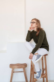 młody biały kobieta siedzi obok biały cegła ściana śmiech