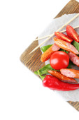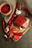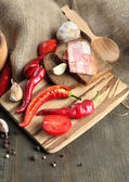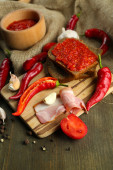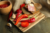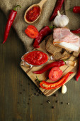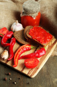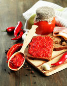 Kompozycja z sosem salsa na chleb,, red hot chili peppers oraz czosnek, na wory na drewniane tła