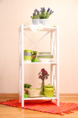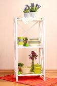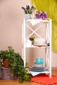 piękne Białe półki z naczynia i wystrój, na tle ściany kolor