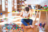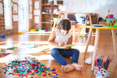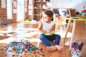 Zdjęcie "Uroczy maluch leżący na rysunku podłogi przy użyciu papieru i ołówków w przedszkolu" może być wykorzystywane do celów osobistych i komercyjnych zgodnie z warunkami zakupionej licencji Royalty-free. Obraz jest dostępny do pobrania w jakości wysokiej rozdzielczości do 5760x3840.