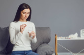 Koncepcja wirusa ból głowy choroba grypy. Szklanka tabletek na wodę w rękach dziewcząt siedzących w pokoju