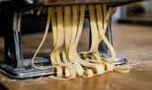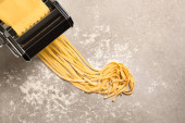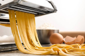 Kobieta przygotowuje makaron z maszyny makaron przy stole, blisko