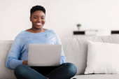Dziewczyna Zakupy z laptopem i karty kredytowej w łóżku