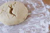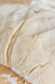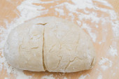 Gotowe ciasto ugniatane na drewnianym stole w domu