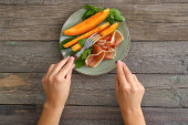 Zdjęcie "Kobieta je smaczną sałatkę przy stole" może być wykorzystywane do celów osobistych i komercyjnych zgodnie z warunkami zakupionej licencji Royalty-free. Obraz jest dostępny do pobrania w jakości wysokiej rozdzielczości do 5760x3840.