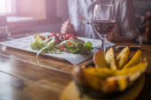 przycięty widok afrykańskiego Amerykanina cięcia papryka i kobieta trzyma kieliszek wina