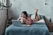 radosna młoda kobieta korzystająca z laptopa podczas relaksu w sypialni