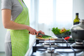 Zdjęcie "Siekane warzywa na desce do krojenia dań warzywnych i świeżych sałatek w kuchni w domu. Przygotowanie do kolacji. Czyste zdrowe jedzenie i prawidłowe odżywianie. Dieta " może być wykorzystywane do celów osobistych i komercyjnych zgodnie z warunkami zakupionej licencji Royalty-free. Obraz jest dostępny do pobrania w jakości wysokiej rozdzielczości do 5760x3840.