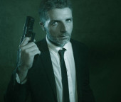 grunge kinowy portret atrakcyjnego i niebezpiecznego zabójcy lub tajnych służb specjalny agent w akcji celując broń w mafii przestępczej i koncepcji stylu życia przestępczego