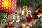 Butelki olejku eterycznego ze świeżymi gałązkami jodły