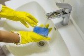 Kobieta w rękawiczkach sprzątanie kuchni.