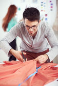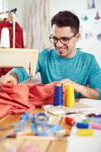 Dedykowana krawcowa stojąca obok stołu i cięta tkanina dla eleganckiej sukienki.