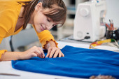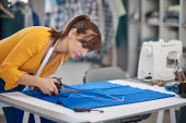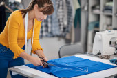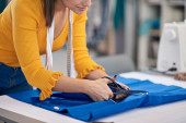 Zdjęcie "Dedykowana krawcowa stojąca obok stołu i cięta tkanina dla eleganckiej sukienki." może być wykorzystywane do celów osobistych i komercyjnych zgodnie z warunkami zakupionej licencji Royalty-free. Obraz jest dostępny do pobrania w jakości wysokiej rozdzielczości do 5760x3840.