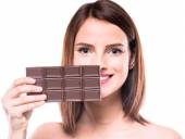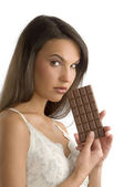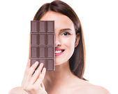 portret piękna, młoda dziewczyna z czekolady na brązowym tle