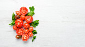 Zdjęcie "Świeże czerwone pomidory na ciemnym tle. Warzywa. Widok góry. Wolne miejsce na tekst." może być wykorzystywane do celów osobistych i komercyjnych zgodnie z warunkami zakupionej licencji Royalty-free. Obraz jest dostępny do pobrania w jakości wysokiej rozdzielczości do 5760x3840.