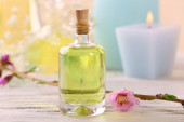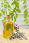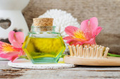 Mała butelka z dzikich kwiatów infuzji (ekstrakt, nalewka, olejek eteryczny). Koncepcja aromaterapii, spa i medycyny ziołowej. Przestrzeń kopiowania, stare drewniane tło