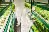 Dwóch pracowników szklarni w kombinezonach ochronnych, rękawiczkach i maskach patrzących przez zielone sadzonki