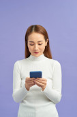Portret młodej uśmiechniętej kobiety korzystającej z telefonu komórkowego na fioletowym tle