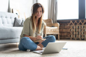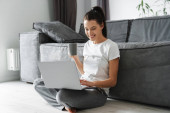 Cute uśmiechnięta studentka z dredami robi notatki siedząc na podłodze przed laptopem