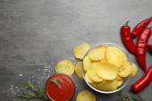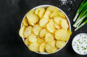 Płyta ze smacznymi chipsami ziemniaczanymi na stole, zbliżenie