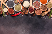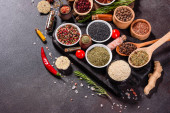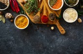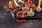 Zestaw przypraw i ziół. Kuchnia indyjska. Pieprz, sól, papryka, bazylia i inne na ciemnym tle