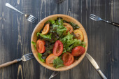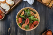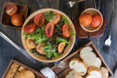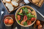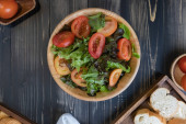 płaska sałatka warzywna na misce i chlebie