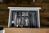 kolekcja błyszczących sztućców w czarnym pojemniku w kuchni, widok z bliska