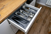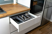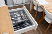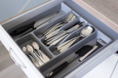 kolekcja błyszczących sztućców w czarnym pojemniku w kuchni